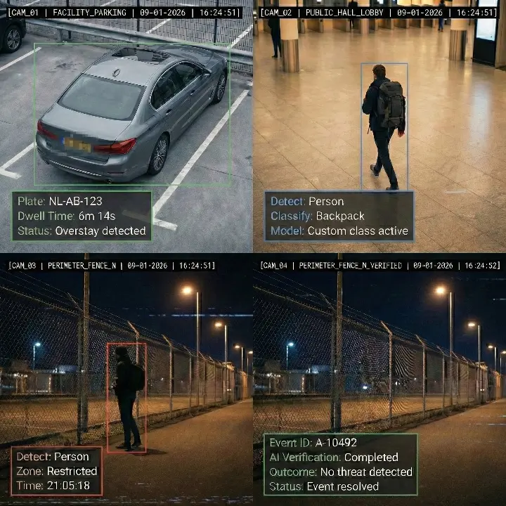السياق التشغيلي. أضف مناطق اهتمام للإنذارات وتجاوز الاكتشاف البسيط — اقرأ النصوص (OCR)، وامسح رموز QR والرموز الشريطية، وقِس مدة البقاء (التسكع) لرقمنة العمليات المادية.