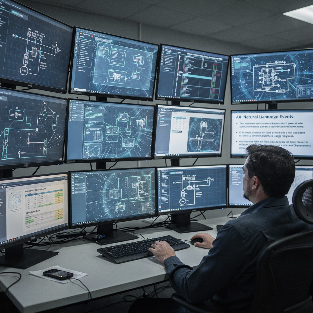 Sala de control con paneles de seguridad asistidos por IA
