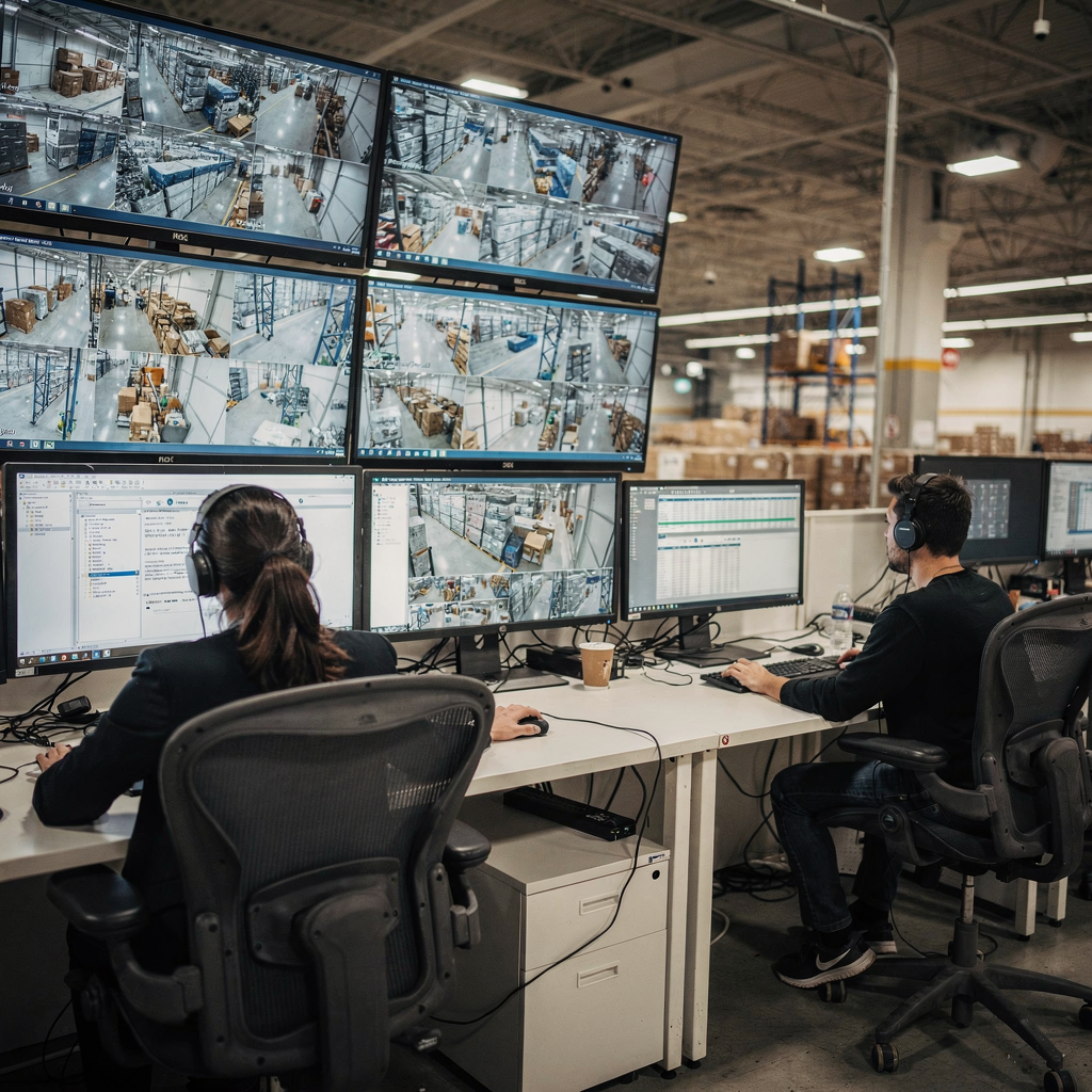 Pantalla de sala de control con múltiples transmisiones de cámaras y segmentos señalados