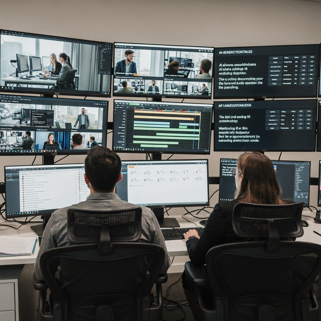 A busy security control room with multiple monitors showing different camera angles, UI overlays indicating detected individuals and vehicles, and a central operator using a touch interface