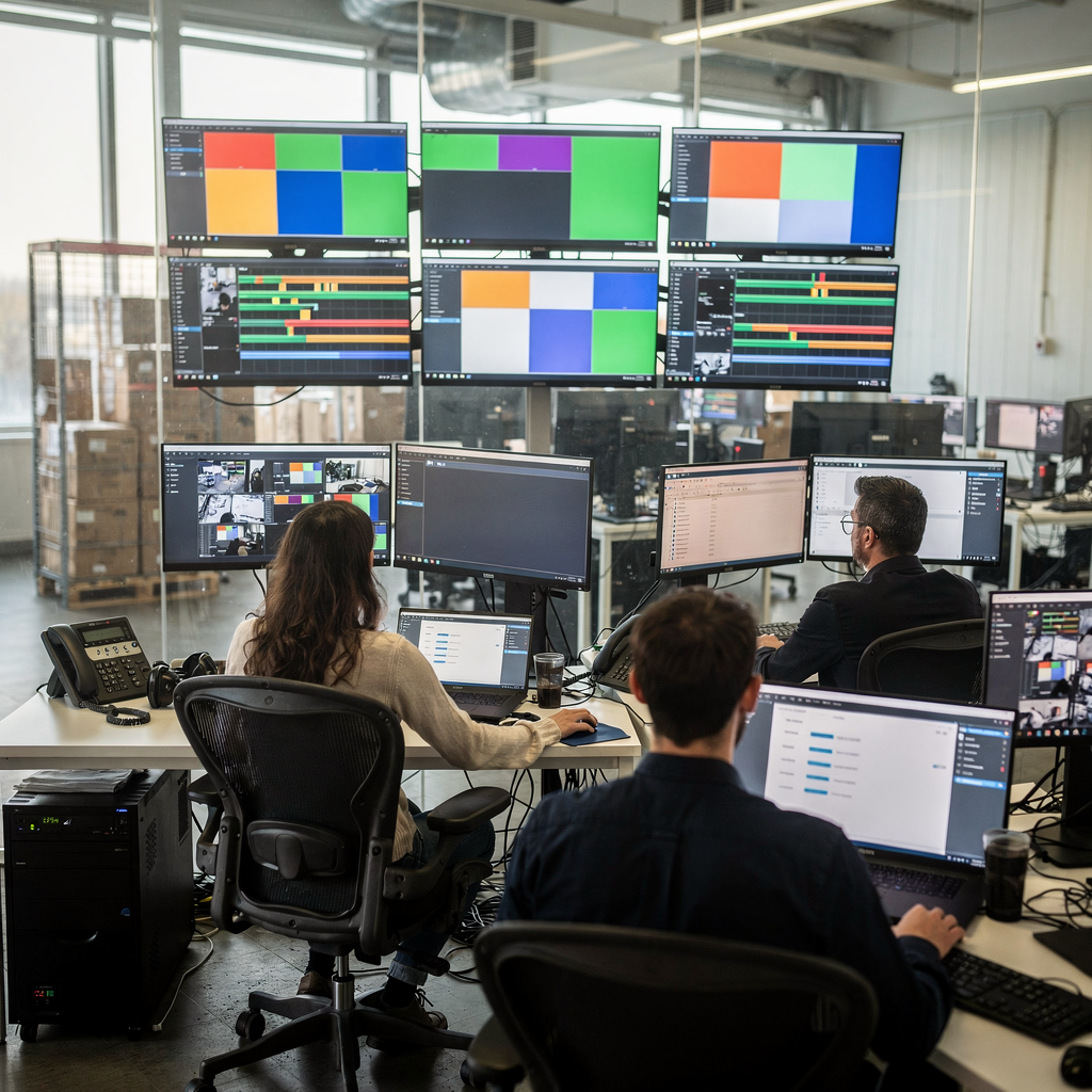 Ekrany centrum kontrolnego z miniaturami wideo i opisami generowanymi przez AI