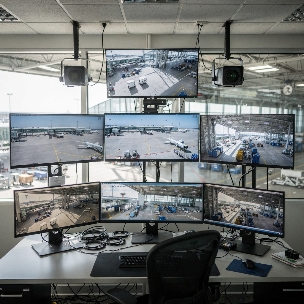 Sala de controle com feeds de câmeras anotados
